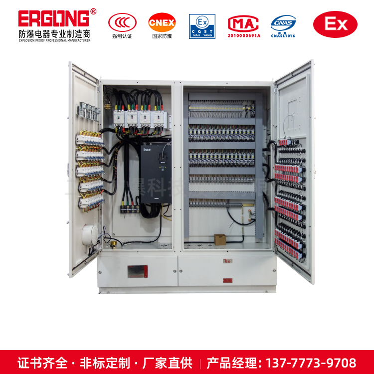 2. 本产品为“二工电气”改进型防爆产品,可根据用户要求安装各种普通的检测仪表、分析仪表、显示仪表、变压器、软启动器、变频器、PLC、各种按钮、开关、微电脑触摸屏以及普通电器元件,对用户需装电器元件完全不受限制;