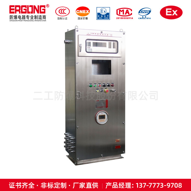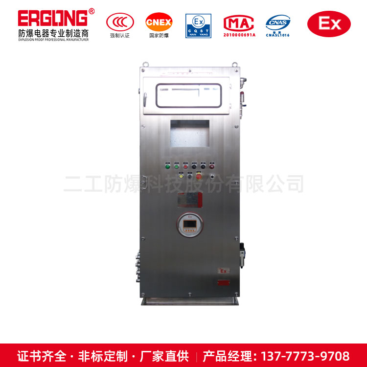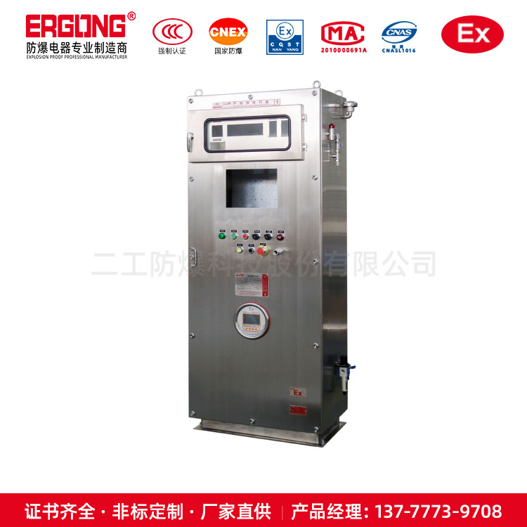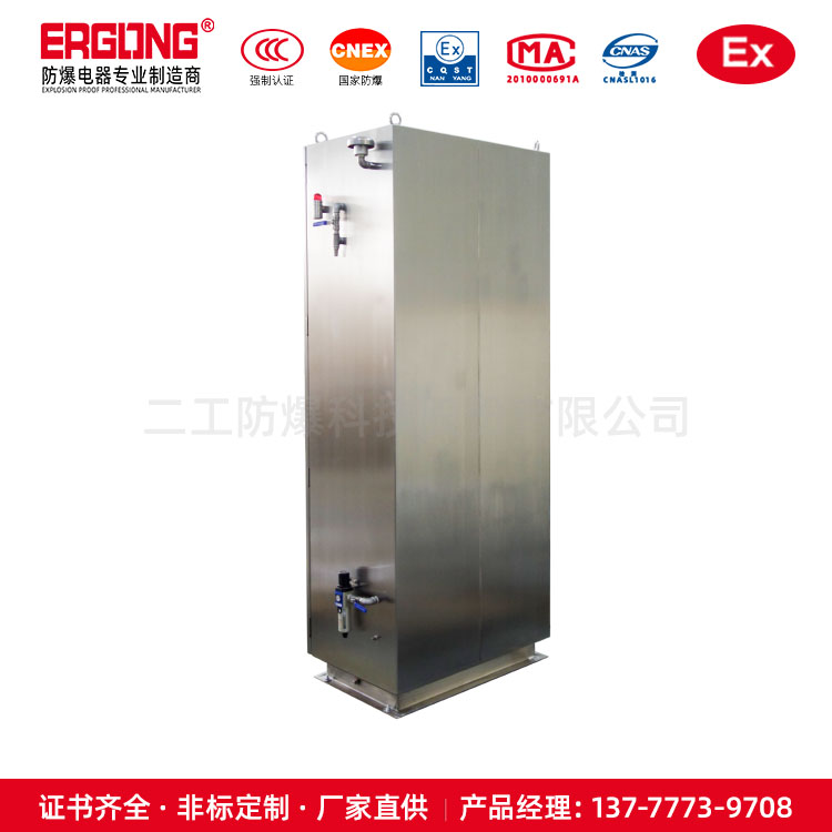 采用介质隔离点燃源的防爆措施。即:把用户所用的电器元件安装在一个充满正压洁净气体的柜体内,使外部环境中易燃易爆的混合性气体无法接触到电器元件在正常工作时所产生的电火花或危险温度,从而达到电器防爆的目的。