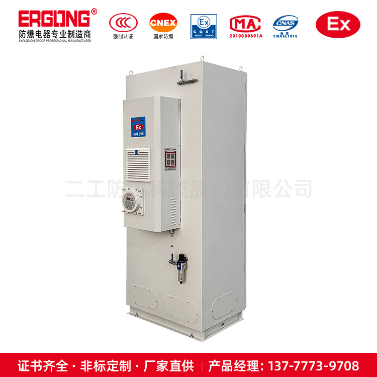 采用介质隔离点燃源的防爆措施。即:把用户所用的电器元件安装在一个充满正压洁净气体的柜体内,使外部环境中易燃易爆的混合性气体无法接触到电器元件在正常工作时所产生的电火花或危险温度,从而达到电器防爆的目的。