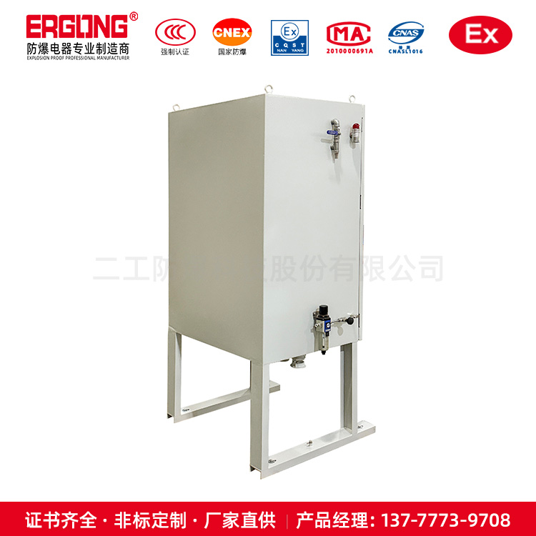 采用介质隔离点燃源的防爆措施。即:把用户所用的电器元件安装在一个充满正压洁净气体的柜体内,使外部环境中易燃易爆的混合性气体无法接触到电器元件在正常工作时所产生的电火花或危险温度,从而达到电器防爆的目的。