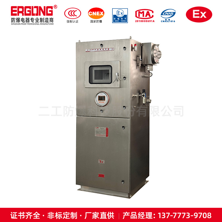采用介质隔离点燃源的防爆措施。即:把用户所用的电器元件安装在一个充满正压洁净气体的柜体内,使外部环境中易燃易爆的混合性气体无法接触到电器元件在正常工作时所产生的电火花或危险温度,从而达到电器防爆的目的。