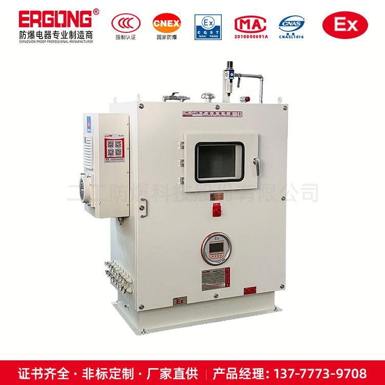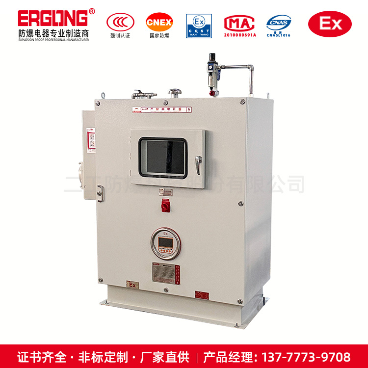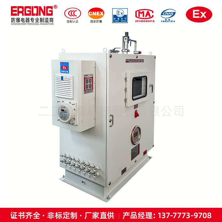采用介质隔离点燃源的防爆措施。即:把用户所用的电器元件安装在一个充满正压洁净气体的柜体内,使外部环境中易燃易爆的混合性气体无法接触到电器元件在正常工作时所产生的电火花或危险温度,从而达到电器防爆的目的。